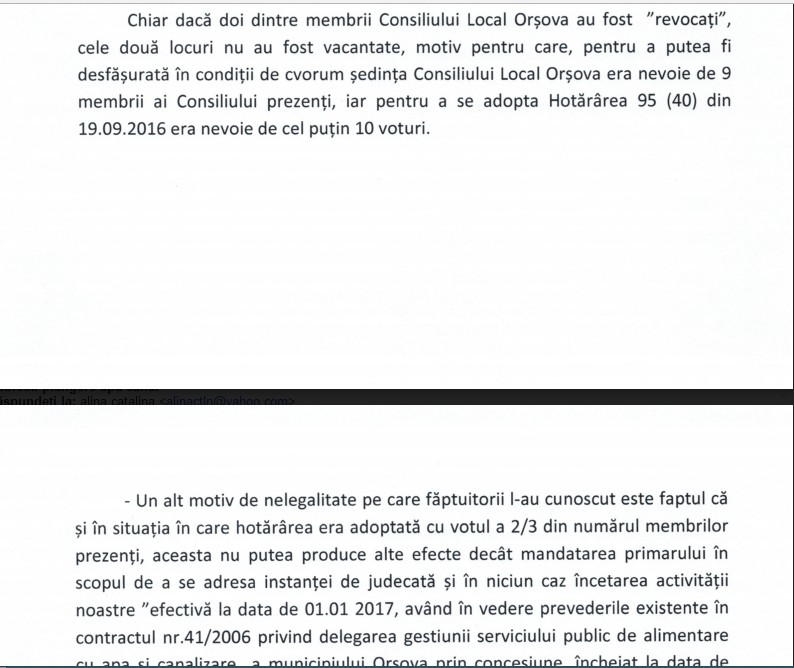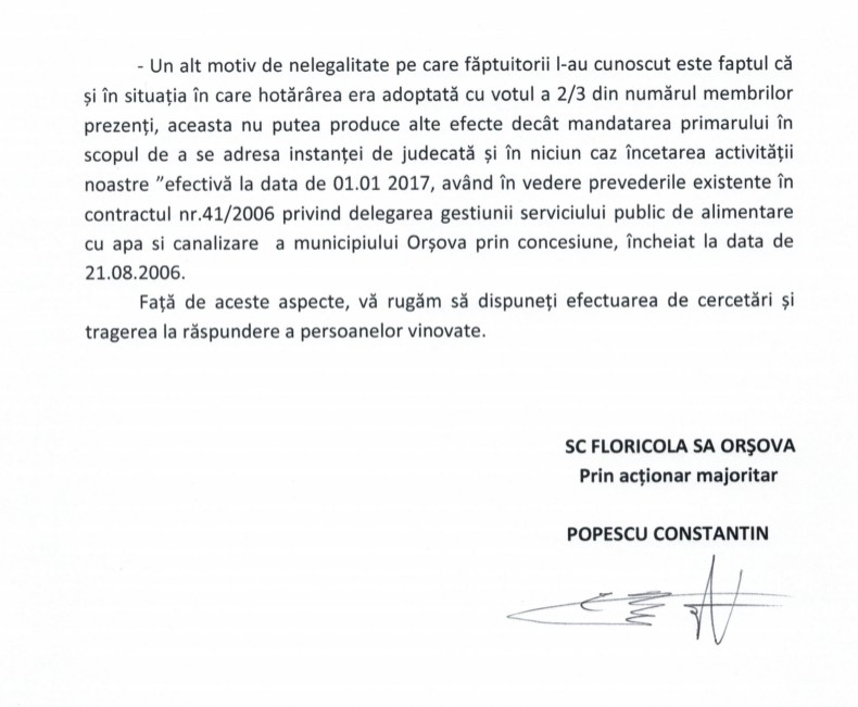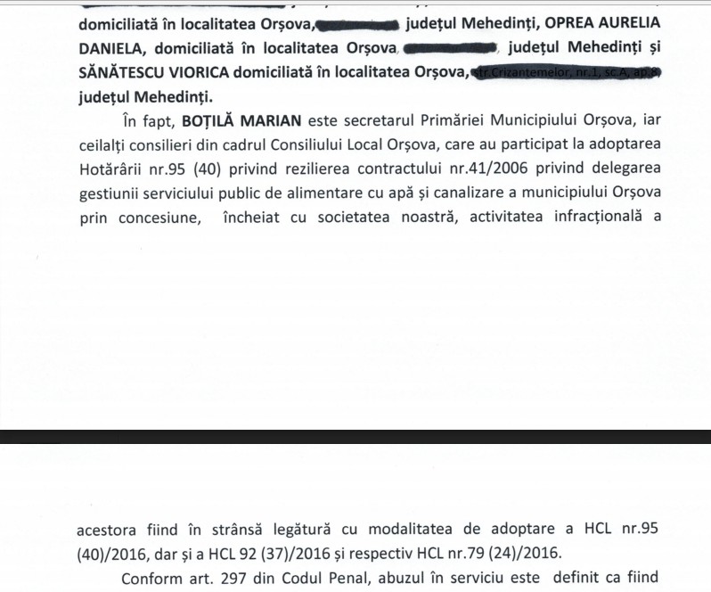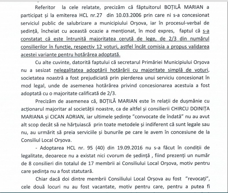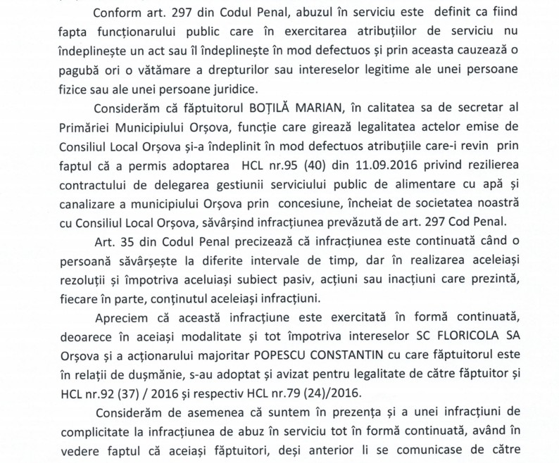 ,,Considerăm că făptuitorul Marian BoÅ£ilă, în calitatea sa de secretar al Primăriei Municipiului OrÅŸova, funcÅ£ie care girează legalitatea actelor emise de Consiliul Local OrÅŸova ÅŸi-a îndeplinit în mod defectuos atribuÅ£iile care-i revin prin faptul că a permis adoptarea HCL nr. 95 (40) din 15.09.2016 privind rezilierea contractului de delegarea gestiunii serviciului public de alimentare cu apă ÅŸi canalizare a municipiului OrÅŸova prin concesiune, încheiat de societatea noastră cu Consiliul Local OrÅŸova, săvârÅŸind infracÅ£iunea prevăzută de art. 297 Cod Penal. Apreciem că această infracÅ£iune este exercitată în formă continuată, deoarece în aceiaÅŸi modalitate ÅŸi tot împotriva intereselor SC Floricola SA OrÅŸova ÅŸi a acÅ£ionarului majoritar Popescu Constantin cu care făptuitorul este în relaÅ£ii de duÅŸmănia, s-au adoptat ÅŸi avizat pentru legalitate de către făptuitor ÅŸi HCL nr. 92 (37) / 2016 ÅŸi respectiv HCL nr. 97 (24) / 2016. Considerăm de asemenea că suntem în prezenÅ£a ÅŸi a unei infracÅ£iuni de complicitate la infracÅ£iunea de abuz în serviciu tot în formă continuată, având în vedere faptul că aceiaÅŸi făptuitori, deÅŸi anterior li se comunicase de către secretarul Primăriei Municipiului OrÅŸova că hotărârile privind patrimoniul, se adoptă cu votul a 2/3 din numărul total al consilierilor locali aflaÅ£i în funcÅ£ie, au continuat să adopte această hotărâre în aceleaÅŸi condiÅ£ii, respectiv cu o majoritate simplă fără a se întruni măcar cvorumul de consilieri necesar pentru a putea desfăşura o ÅŸedinţă de CL în condiÅ£ii statutare. De asemenea apreciem că făptuitorii, în mod intenÅ£ionat ÅŸi repetat au convocat aceste ÅŸedinÅ£e ,,de îndată,, cu toate că ÅŸtiau că nu există nici o urgenţă care să justifice convocarea,, se arată în cea de-a treia plângere penală depusă de către acÅ£ionarul SC Floricola SA.