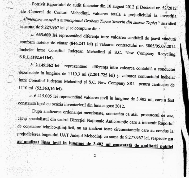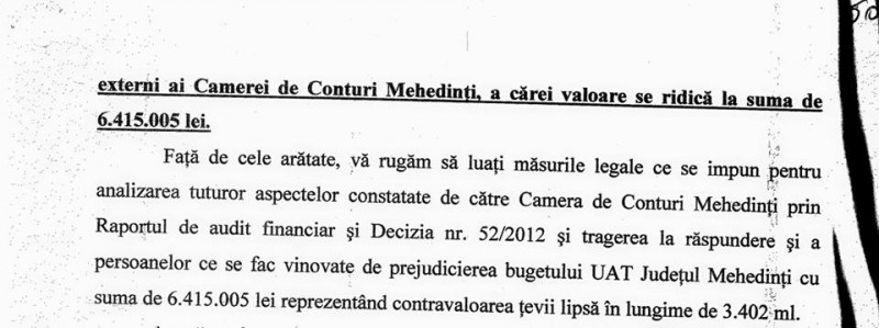 ,,Domnule Marius Bălu, observ cu stupoare că sunteÈ›i foarte preocupat de cheltuirea banului public È™i mă bucur foarte mult că, în sfârÈ™it, cunoaÈ™teÈ›i importanÈ›a acestui fapt. Tocmai pentru că vă văd efervescent È™i dornic de a arăta mehedinÈ›enilor unde È™i cum se duc banii publici, vă rugăm să ne explicaÈ›i cum aÈ›i gestionat investiÈ›ia ”Alimentarea cu apă a municipiului Drobeta Turnu Severin din sursa TopleÈ›”, despre care Raportul de audit financiar din 10 august 2012 È™i Decizia nr. 52/2012 ale Camerei de Conturi MehedinÈ›i, semnalează un prejudiciu în valoare de 9.227.967 lei. Defalcarea sumei totale a prejudiciului o puteÈ›i vedea în pozele documentaÈ›iei ataÈ™ate mai jos. Mi se pare absurd ca din moment ce aduceÈ›i prejudicii Consiliului JudeÈ›ean să vă exprimaÈ›i dorinÈ›a de a veni la conducerea instituÈ›iei È™i să promiteÈ›i că veÈ›i gestiona mai bine banul public! Și pentru că aÈ›i adus atacuri la persoană, printr-o exprimare neadecvată, chiar josnică pentru poziÈ›ia pe care pretindeÈ›i că o aveÈ›i, nu meritaÈ›i respectul meu È™i nici al mehedinÈ›enilor. Cred că a venit momentul să daÈ›i câteva explicaÈ›ii despre investiÈ›iile din perioada mandatului propriu È™i apoi să veniÈ›i cu pretenÈ›ii,, a precizat Aladin Gerogescu, actualul preÈ™edinte CJ MehedinÈ›i.