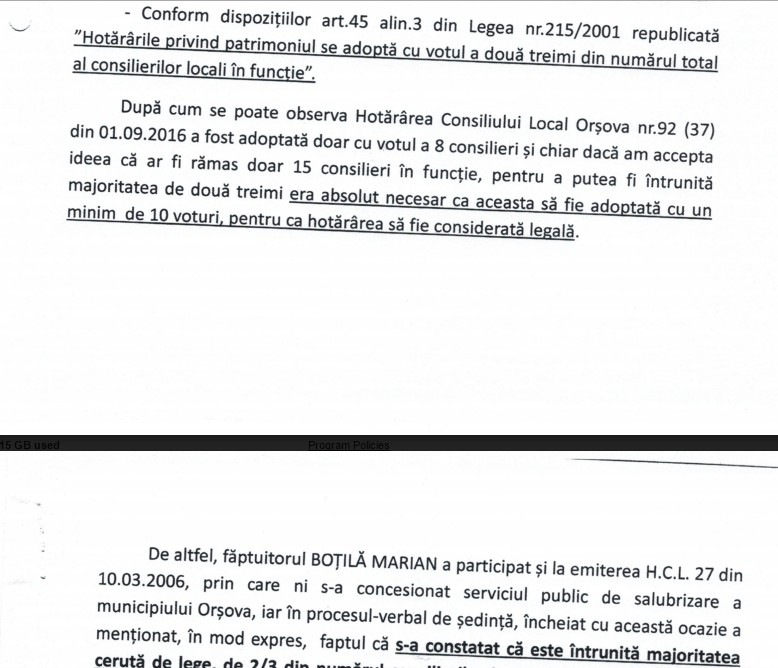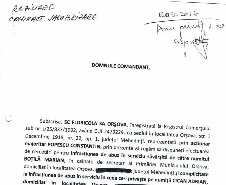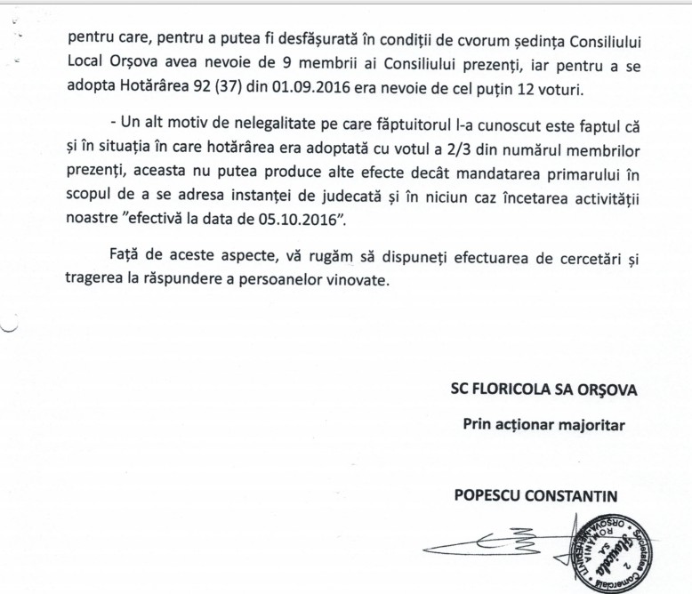 ,,Considerăm că suntem în prezenÅ£a unei infracÅ£iuni atât de abuz în serviciu cât ÅŸi de complicitate la abuz în serviciu din mai multe considerente: conform dispoziÅ£iilor art. 45 alin. 3 din Legea nr. 215/2001 republicată ,,Hotărârile privind patrimoniul se adoptă cu votul a două treimi din numărul total al consilierilor locali în funcÅ£ie,,. Hotărârea CL OrÅŸova nr. 92 din 01.09.2016 a fost adoptată doar cu votul a 8 consilieri ÅŸi chiar dacă am accepta ideea că ar fi rămas doar 15 consilieri în funcÅ£ie, pentru a putea fi întrunită majoritatea de două treimi era absolut necesar ca aceasta să fie adoptată cu un minim de 10 voturi, pentru ca hotărârea să fie considerată legală,, se arată în plângerea formulată către organele legii, de patronul Floricola, domnul Constantin Popescu.