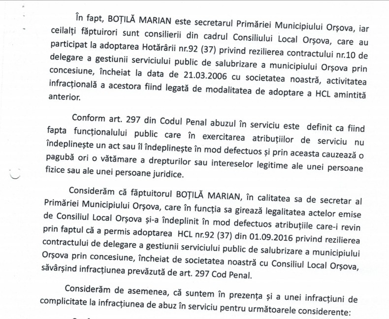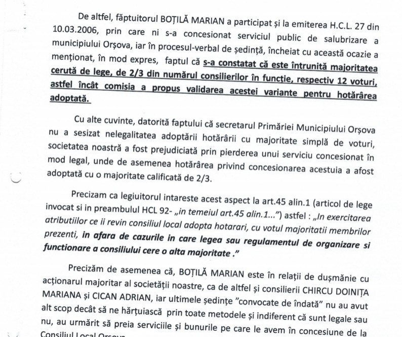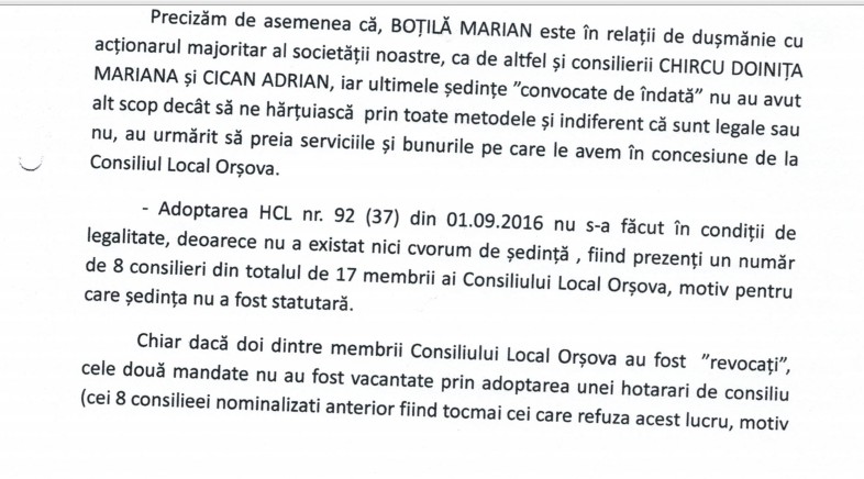 ,,Precizăm de asemenea că, Marian BoÅ£ilă este în relaÅ£ii de duÅŸmănie cu acÅ£ionarul majoritar al societăţii Floricola, ca de altfel ÅŸi consilierii DoiniÅ£a Chircu ÅŸi Adrian Cican, care la ultimele ÅŸedinÅ£e ,,convocate de îndată,, nu au avut alt scop decât să hărÅ£uiască societatea noastră prin toate metodele ÅŸi indiferent că sunt legale sau nu, au urmărit să preia serviciile ÅŸi bunurile pe care le avem în concesiune de la Consiliul Local OrÅŸova. Adoptarea HCL nr. 92 de reziliere a contractului de salubritate nu s-a făcut în condiÅ£ii de legalitate, deoarece nu a existat cvorum de ÅŸedinţă, fiind prezenÅ£i un număr de 8 consilieri din totalul de 17 membrii, motiv pentru care ÅŸedinÅ£a nu a fost statutară. Chiar dacă doi dintre membrii CL OrÅŸova au fost ,,revocaÅ£i,, cele două mandate nu au fost vacantate prin adoptarea unei hotărâri de consiliu. Cei opt consilieri Adrian Cican, Mihai Mircea Brâncoveanu, LaurenÅ£iu Drăghicescu, Vasile Nichescu, DoiniÅ£a Chircu, Camelia Ianculovici, Aurelia Oprea ÅŸi Viorica Sănătescu sunt cei care refuză acest lucru. AÅŸadar, pentru a putea fi desfăşurată în condiÅ£ii de cvorum ÅŸedinÅ£a Consiliului Local OrÅŸova are nevoie de 9 membrii prezenÅ£i, iar pentru a se adopta Hotărârea nr. 92 la care facem referire, era nevoie de cel puÅ£in 12 voturi. Un alt motiv de nelegalitate pe care făptuitorul l-a cunoscut este faptul că ÅŸi în situaÅ£ia în care hotărârea era adoptată cu votul a 2/3 din numărul membrilor prezenÅ£i, aceasta nu putea produce alte efecte decât mandatarea primarului în scopul de a se adresa instanÅ£ei de judecată ÅŸi în niciun caz încetarea activităţii noastre efectivă la data de 5.10.2016,, se mai arată în plângerea depusă.